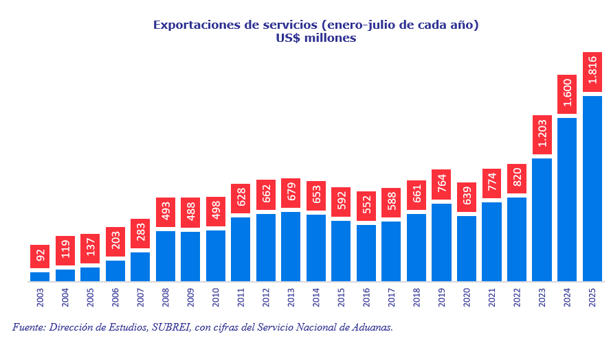 En el caso de las exportaciones de servicios, en la cifra récord alcanzada en el período enero-julio de 2025 destacan los suministros de sedes (“hosting”) para sitios web y correo electrónico (US$ 200 millones); servicios de mantenimiento y reparación de aviones, helicópteros y otros aparatos aéreos (US$ 180 millones); servicios de asesoría en gestión de la comercialización de empresas o marketing (US$ 106 millones); servicios de apoyo técnico en computación e informática por vía remota (US$ 99 millones); y servicios de asesoría en tecnologías de la información (US$ 73 millones); entre otras prestaciones al mundo.