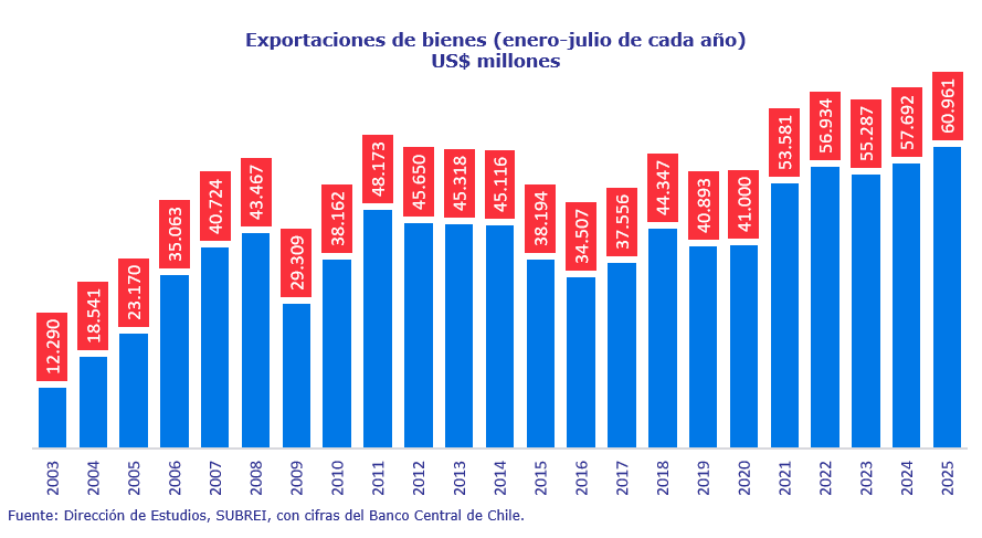 Entre enero-julio del presente año, los envíos de bienes y servicios al exterior totalizaron US$ 60.961 millones y US$ 1.816 millones, respectivamente, alcanzando los mayores valores para un período similar desde que existe registro. Además, las cifras representan un alza de 5,7% y 13,3% respectivamente, en relación con igual período de 2024.