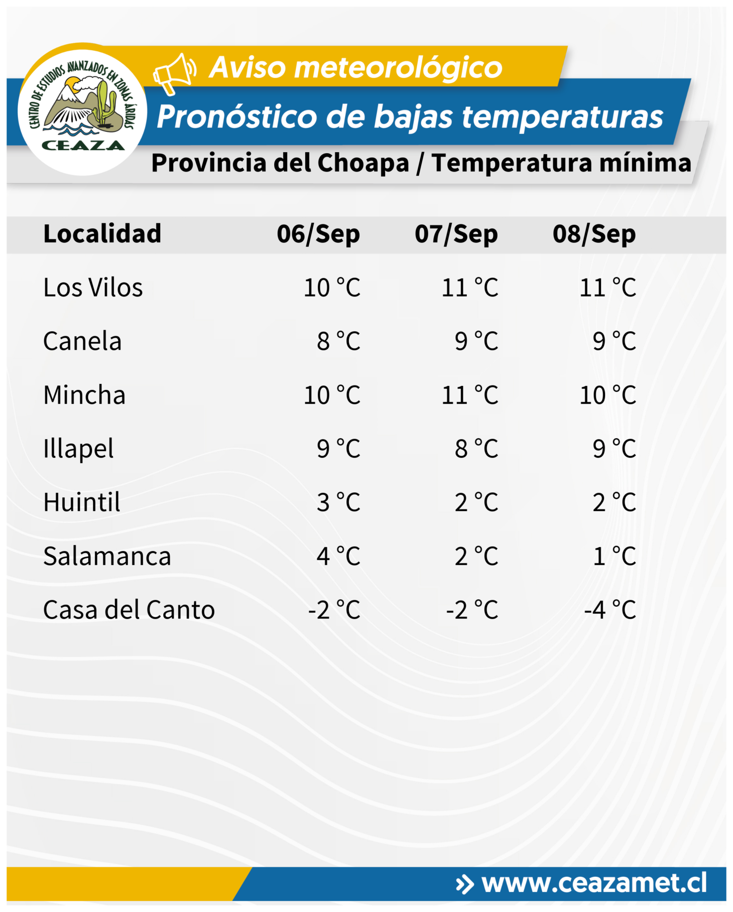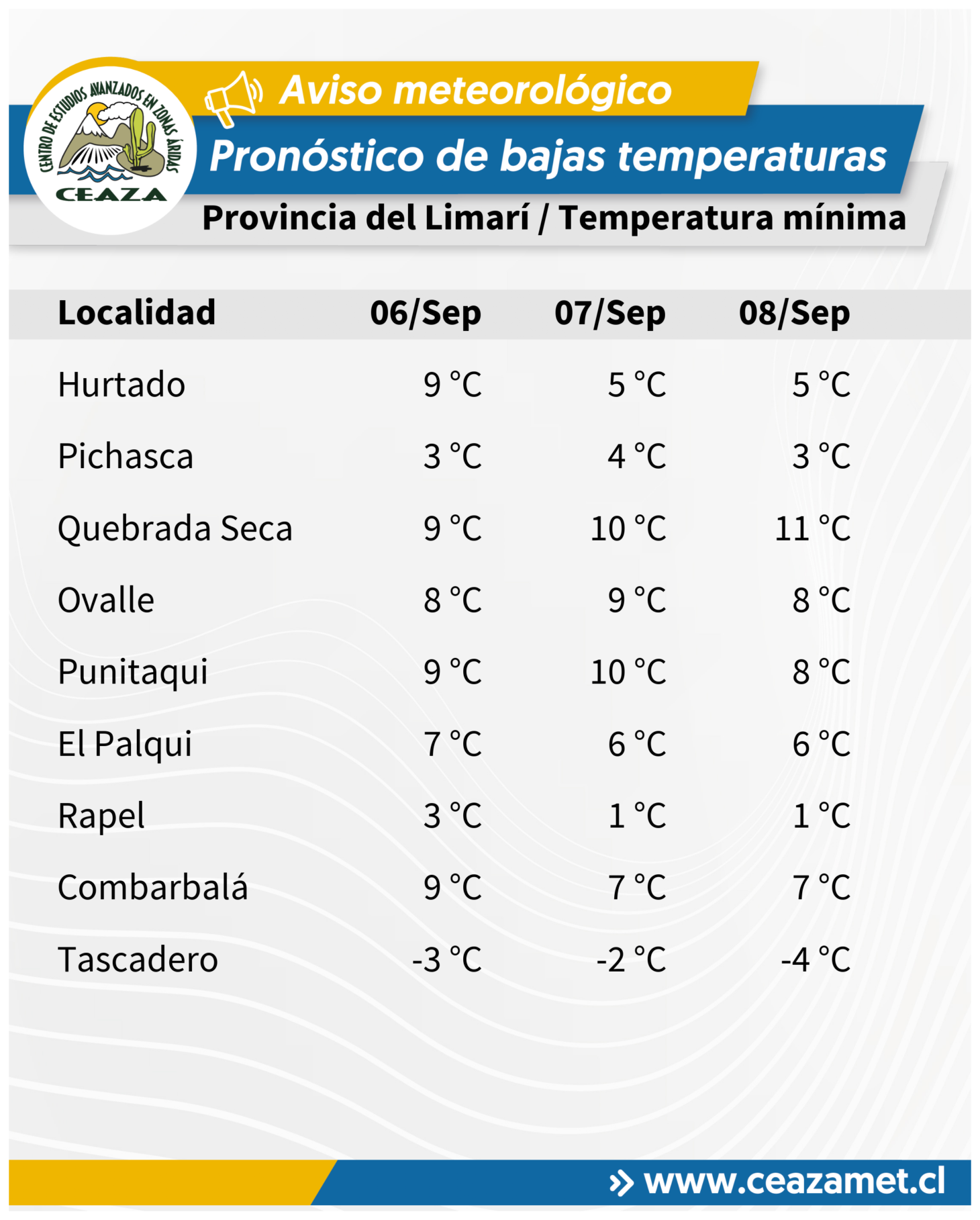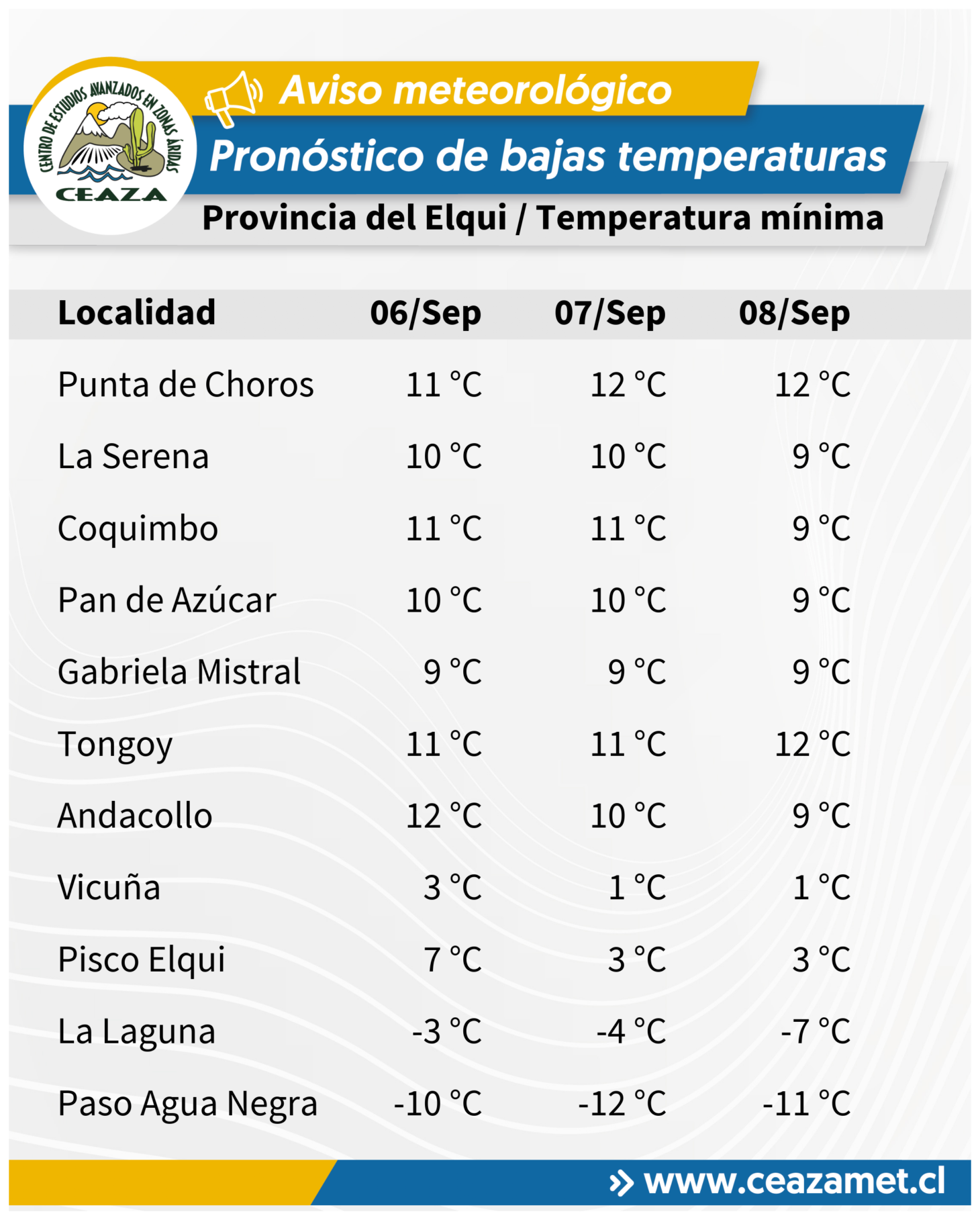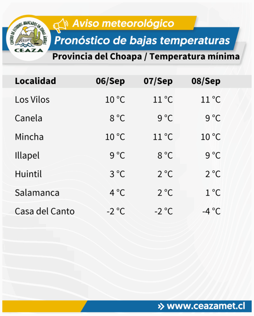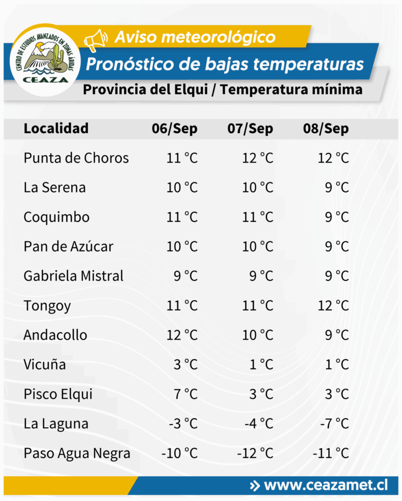 De acuerdo al Centro Científico CEAZA, se pronostican temperaturas mínimas bajo lo normal para la época del año entre los días 6 y 8 de septiembre en la Región de Coquimbo, asociadas al paso de un núcleo frío en altura.