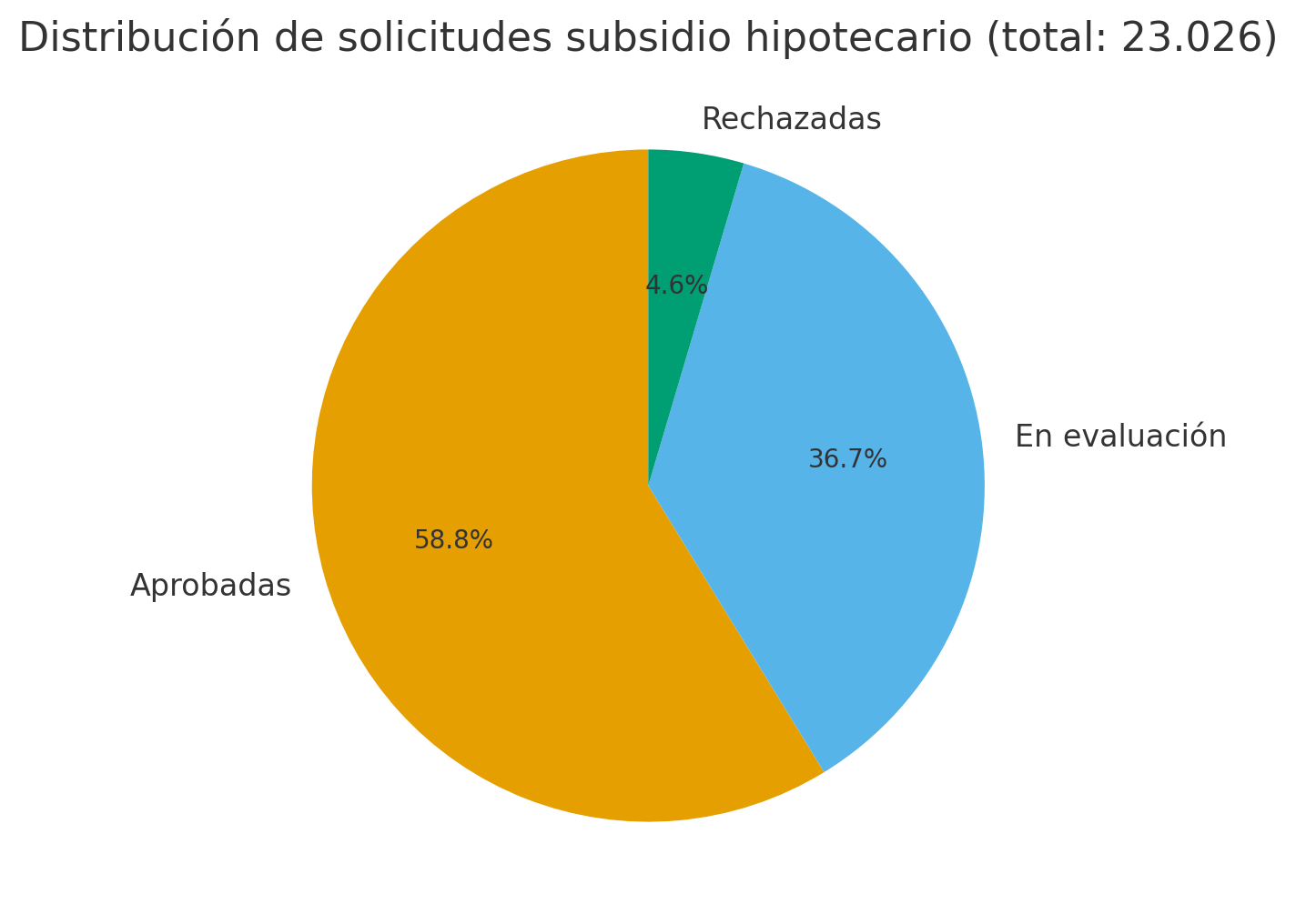 - Las solicitudes aprobadas y en evaluación alcanzan 21.971, equivalente al 95,4% del total recibido. Solo un 4,6% han sido rechazadas